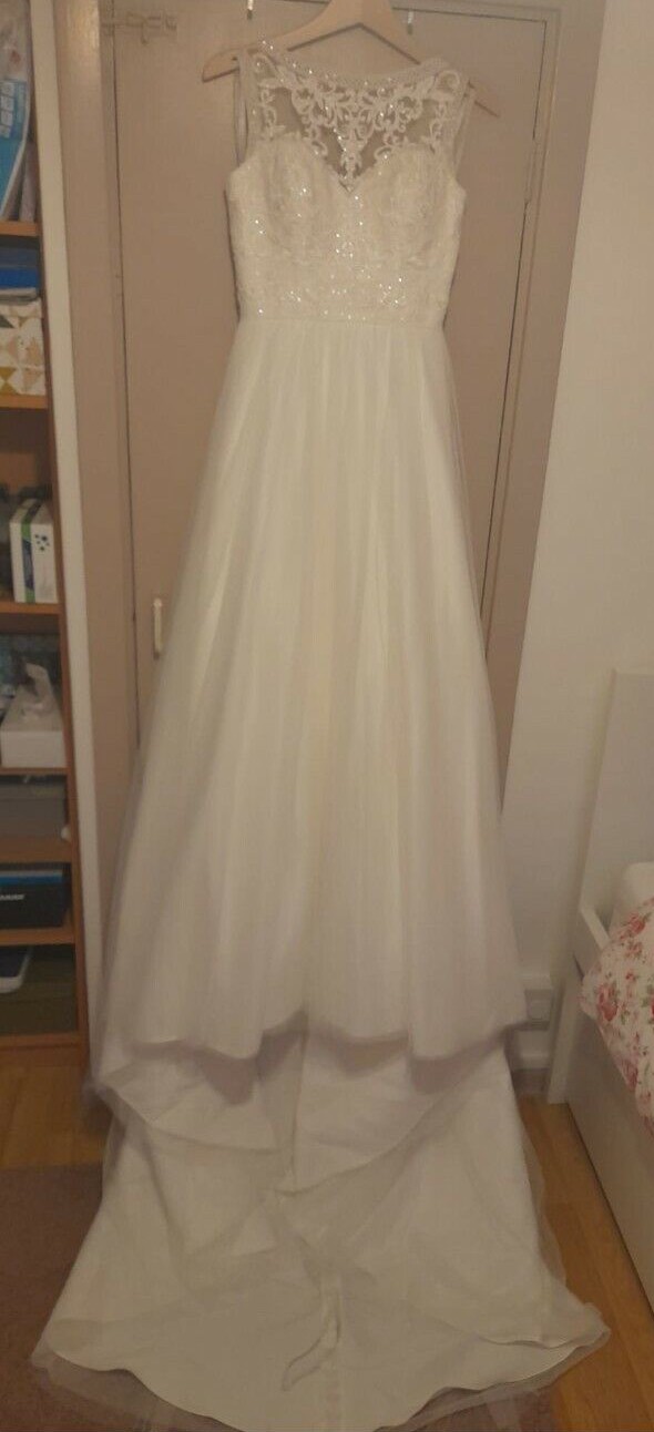 This classic A-line silhouette is exquisite, timeless and effortlessly stunning. Look closely and you’ll see the beautiful floral embroidered lace that covers the bodice with elegant embroidery tape around the waist and across the neckline.