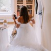 Bronte: The Bronte bridal gown is cut in our lighter than air pebbled organza fabric. The flattering scoop neck is accented by the beautifully pleated bodice and elegantly draped sleeves which can be removed to create a strapless look. The full A line skirt lends a whimsical yet dramatic feel to this timeless gown.