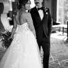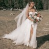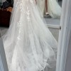 Modern A-line silhouette is sure to captivate. It features custom-made, vine-like 3D motif appliques placed along the V-plunge illusion bodice and floating down the sparkle skirt. Exquisite detailing and tulle form a cascading, dreamy skirt. The soft layers of tulle, sequins scattered net and sheer gauze brings this slit gown even more sexy sophistication, while a lace-framed, corset-style back is the sweetest detail to finish off the look.
