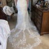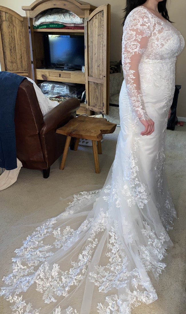 I brought this dress and then changed my mind! I was unable to return the dress. I’ve only tried it on. Never wore it out. Sheer tulle long sleeves and neckline that goes down to vneck. Has lace appliqués and sparkle! Back has buttons and zipper! So pretty. Just changed my idea, look and vibe