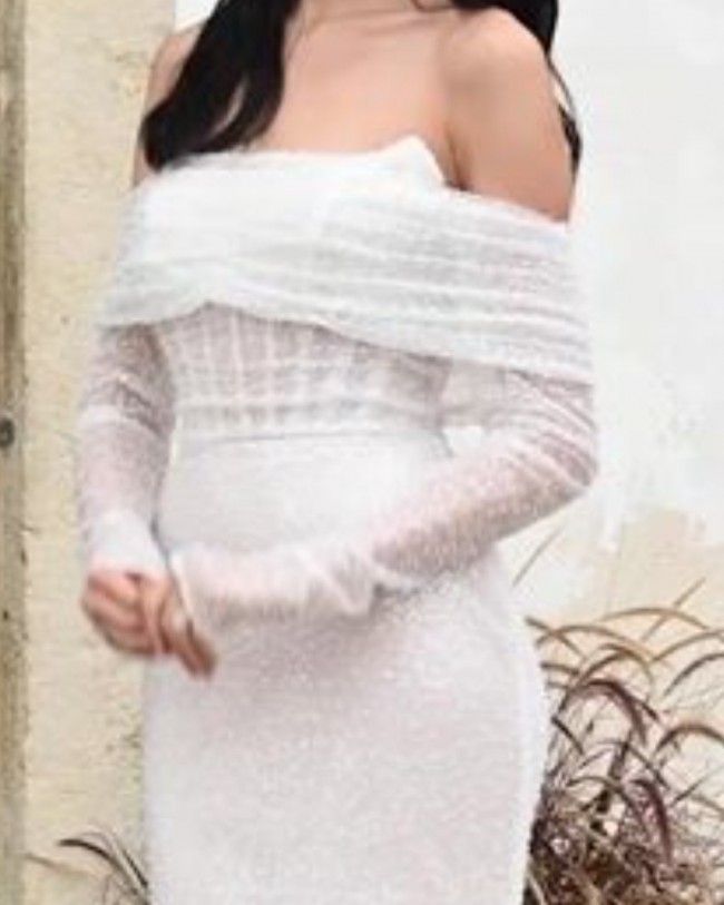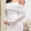 Beautiful off the shoulder beaded bridal overlay with long illusion sleeves....just stunning in person. Bridal buttons go up the outer back. I fell in love with this jacket/shrug as the perfect compliment to my wedding dress, but unfortunately never got the chance to wear it.