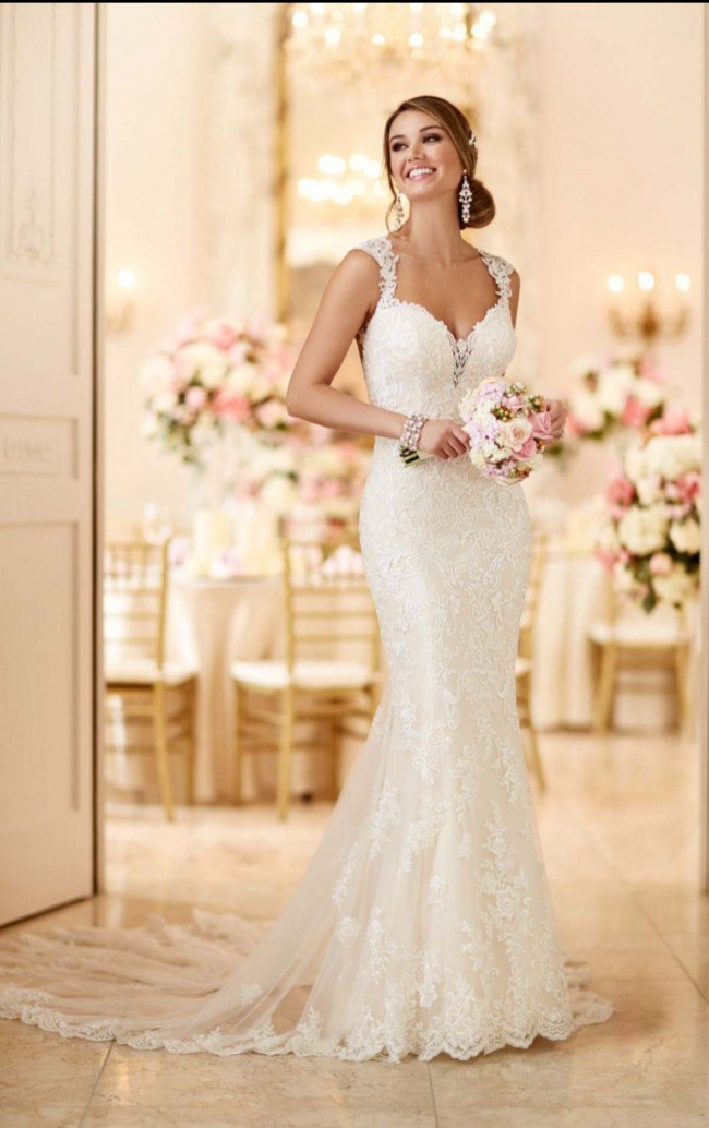 Unaltered, never worn Stella York 6245. Size US 8 but fits like a 4. Never worn but has been dry cleaned from moving. Only minor flaw is the back button hole loops look a little worn out.