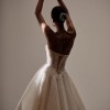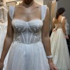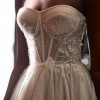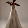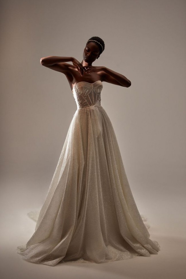 A-line glitter wedding dress with strapless sweetheart corset decorated with beaded appliques and bow on the waistline.