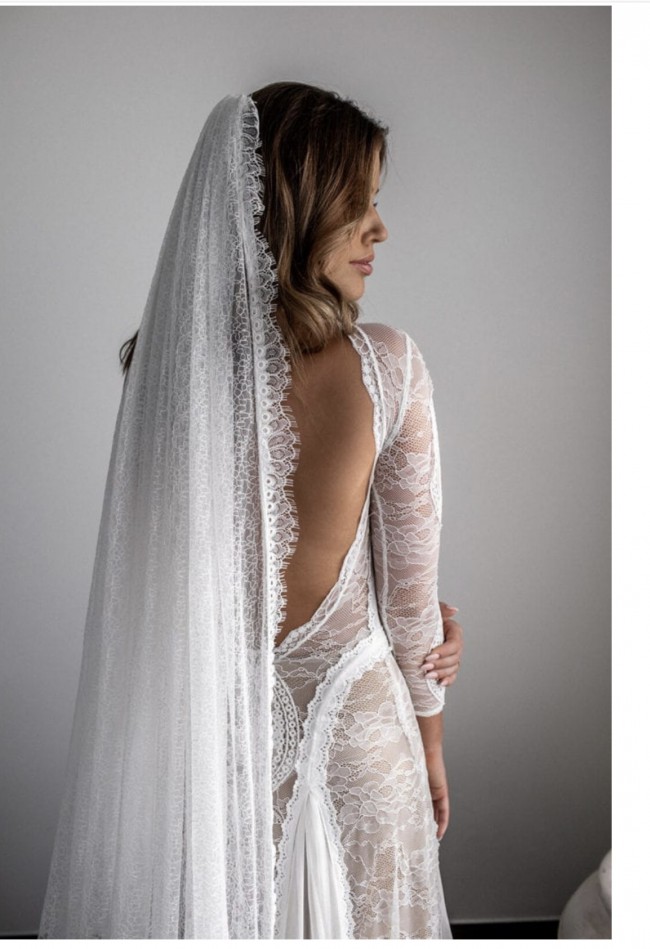 Beautiful INCA grace loves lace custom made. nude lining, long sleeve backless dress. French and japenwse lace hand crafted, delicate and intricate detailing.
