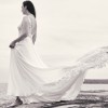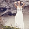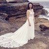 Effortless and romantic, this chiffon A-line bridal dress will make you feel like a bride. It features a plunging illusion Sabrina neckline that perfectly blends with your skin, making the sequined lace appliqués appear to be floating along the neckline up to the straps. A Chantilly lace underlay in the sheer bodice offers a touch of extra detailing. Appliqués cascade down onto the floaty chiffon skirt and continue around to create a stunning cutout chapel length train. It’s complete with a sexy V-back accented with covered buttons cascading down to the start of the train