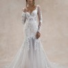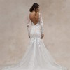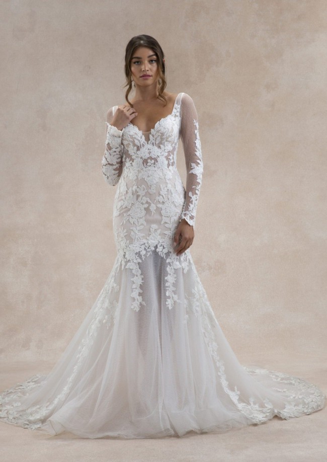 Soft fit to flare tulle gauze gown with lace applique detail and romantic long sleeves. Ivory lace pops against blush lining.