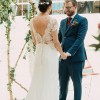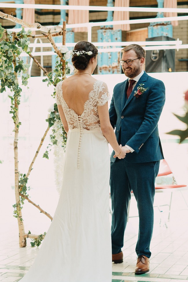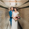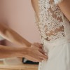 This is a genuine Louise Selby Fox Glove dress with cap sleeves. It is made from ivory silk crepe with French coided lace top. The train has been slightly shortened by Louise Selby from the original to remove the part which was dirty. The train is still a decent length and it just has a few tiny marks which are hardly noticeable. There is a loop on the back of the train to attach it to the bottom button at the back when dancing etc.