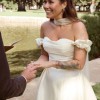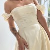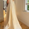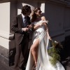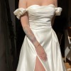 A direct replica of one of Danielle Cooperman’s, wedding gown. This strapless style is elegant and timeless and is made from a beautiful warm ivory satin. The Danielle features a hidden corset inside the dress with peeping visible bust cups at the neckline. There is a discreet swathe of fabric on the front bodice and the seams angle inwards creating a very flattering cut. The off-the-shoulder sleeves are constructed with a gentle organic twist which creates a sculptural look; and there is hidden elastic for ease of movement. The back neck edge is cut with a gentle scoop, high enough for full support and is fastened with a zip. The skirt is draped into the side waist and forms a sculptural split detail. The back of the skirt has volume tucked into the waist to form inverted box pleats which cascade into a dramatic train. The side split elevates this classic gown to a super sexy, romantic, and contemporary place. This is a versatile and very flattering gown for all body types.