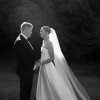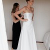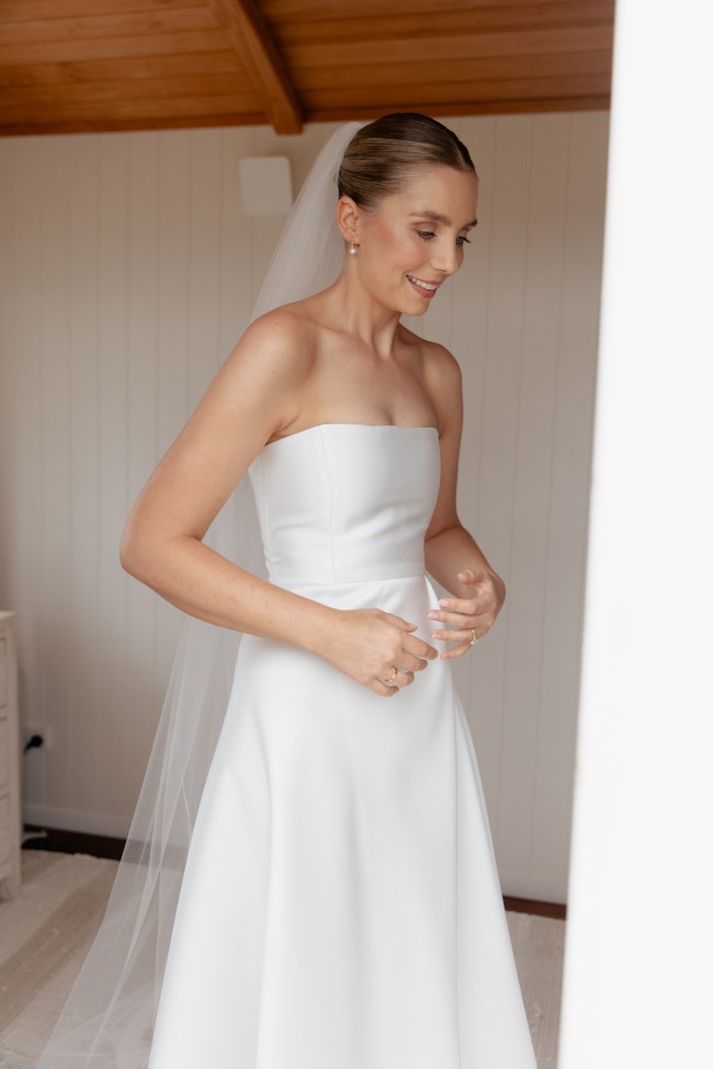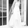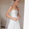 Modern tight fitting bodice with a square neck line falling into a skirt and long draping train.