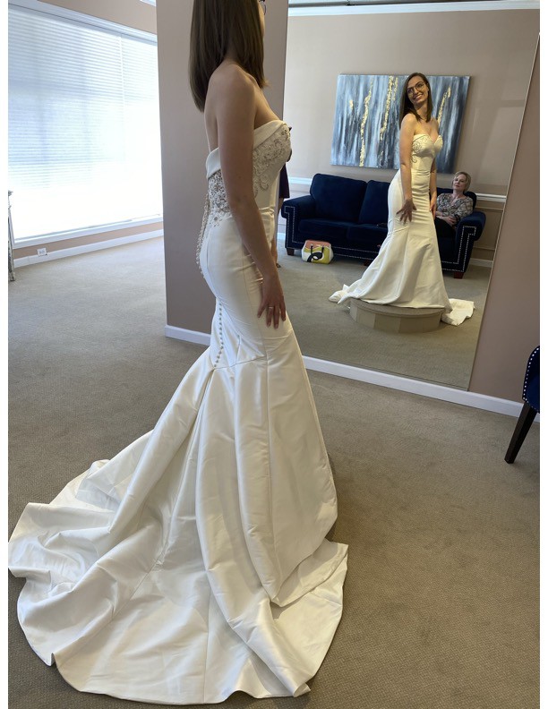 I bought this dress for my wedding and ended up loving a different dress so I never wore it! It is still in the original box from the store and has no alterations.