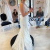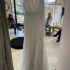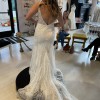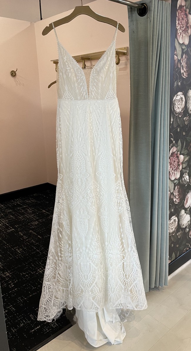 This dress has never been worn. It is split sizing. The top is size 1, waist is size 2 and hips size 3. It just was delivered April of 2024. I have not worn it and have canceled my wedding so it is brand new. The one in the photos is the floor model. If needed I can send more photos of the actual one!