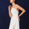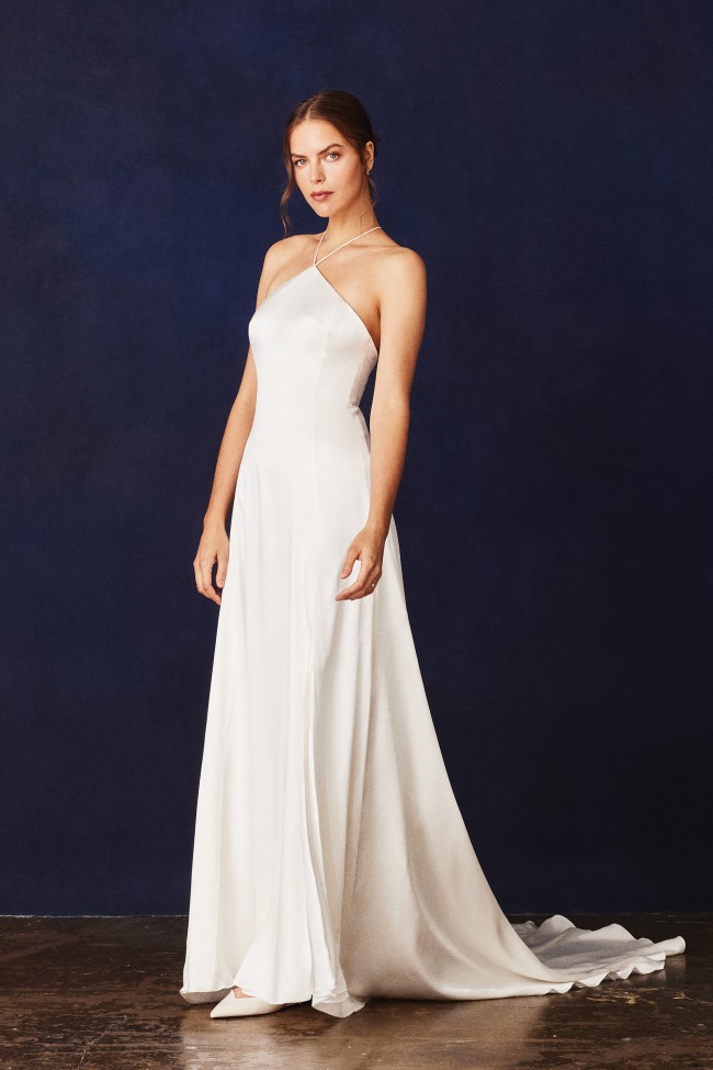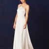 Honey gown is cut on the bias in Savannah Miller Bridal’s signature champagne silk satin, Honey has a fully-boned hidden supportive bodice. The halter-neck comes to a point at the clavicle and is held up with fine spaghetti straps that meet at the back neck to form a delicate “T” double strap detail, fastened with a pearl button our signature pearl zip puller. The princess bodice seams extend the full length of the A-line skirt off-set with a thigh-high split in the skirt and chapel length train.