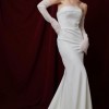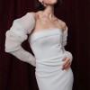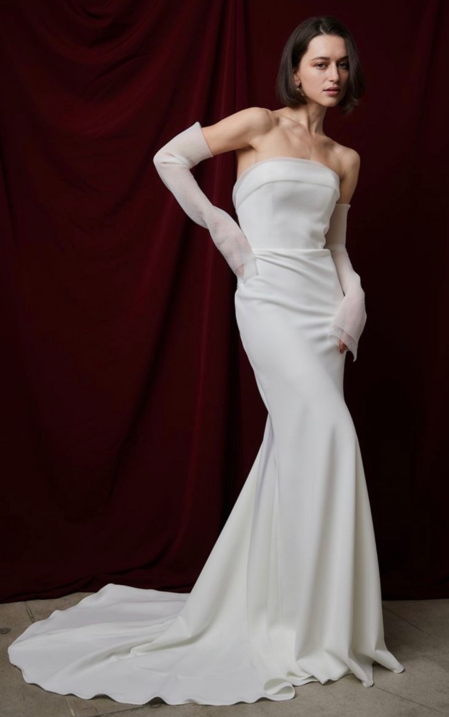 The fate dress is a classy and timeless silhouette with a modern touch. Stunning crepe, organza trimmed bodice with boning, and paired with the matching organza veil and fabric covered buttons on train.