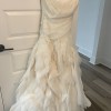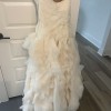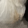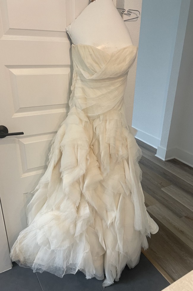 Beautiful Vera Wang Diana dress. I had it altered at the bottom to shorten the length (I’m 5’7). It does have a few stains but all should come out with cleaning. The red marks are on the inside and not visible on the outside of the dress.