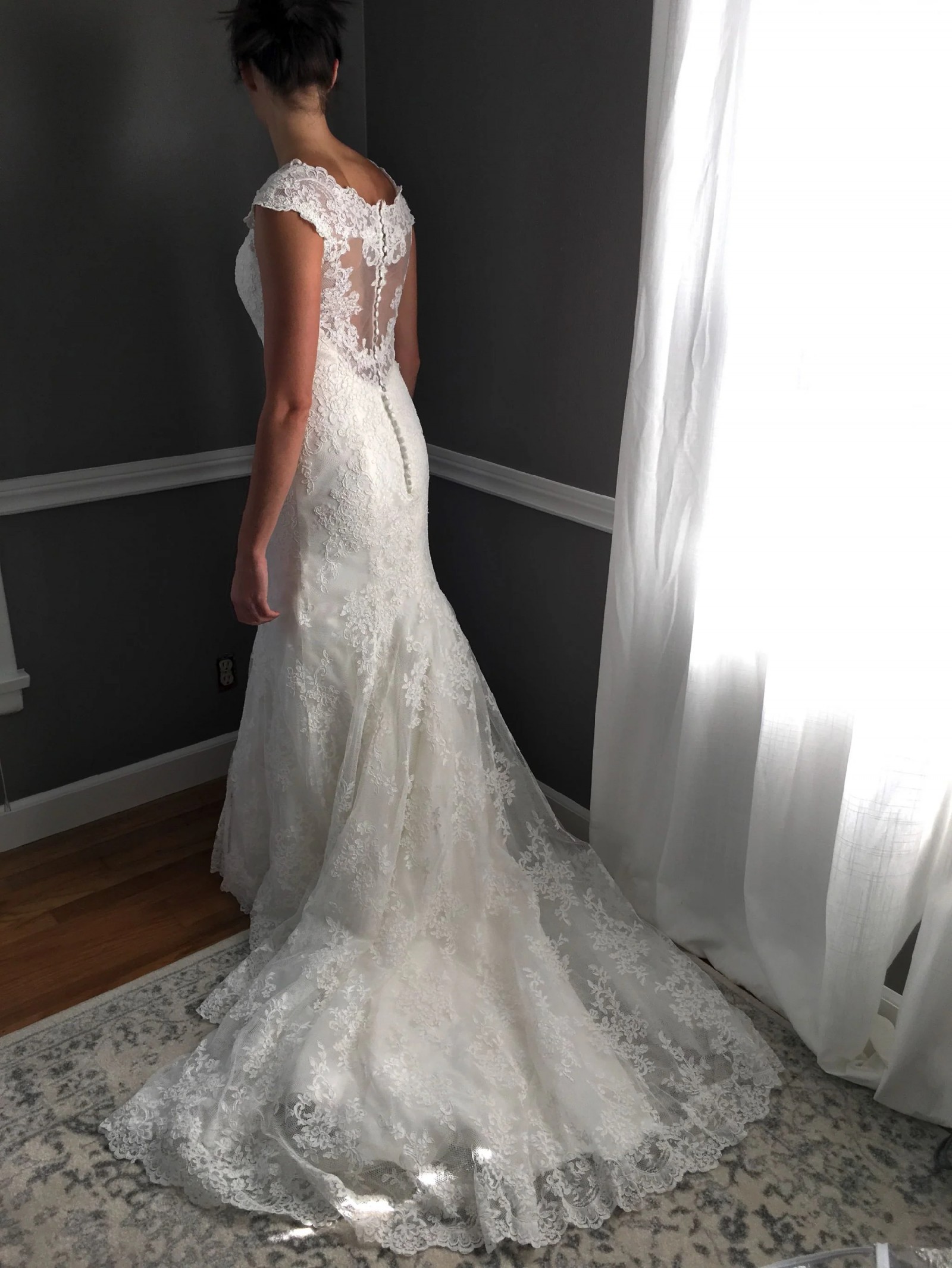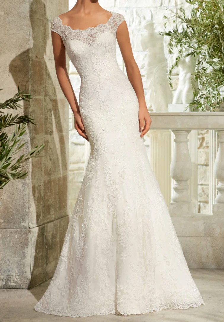 Beautiful, new original authentic ivory designer gown by Madline Gardner. This dress was only worn when tried on in the studio and again for the photos in this listing. Since it is in it's original form, It can be altered for the perfect fit on any bride wearing a size 7/8 US.