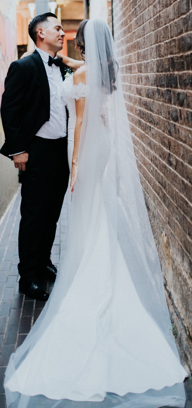 This is a current season 2024 wedding gown; no alterations have been made to the top, and none to the dress either other than hemming the length. The hemming was exceptionally done by Nadi (of the famous Nadi's Bridal & Alteration Studio in Sydney). Of course, the dress, top and veil have all been dry-cleaned and steamed back to brand-new condition.
