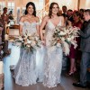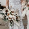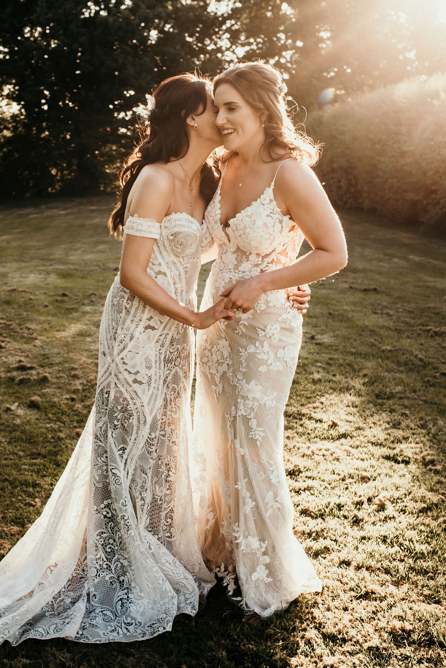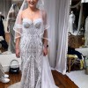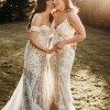 Byron is a classic, fitted bustier shape, with a modern bohemian charm. Strapless style with off-the-shoulder fitted detached lace armbands. Bustier style bodice with in-build boning and keyhole back. Fit and flare silhouette with off-white intricate lace detailing contrasted with nude coloured lining. Dramatic unlined lace train with a dancing loop. Zip closure at centre back.