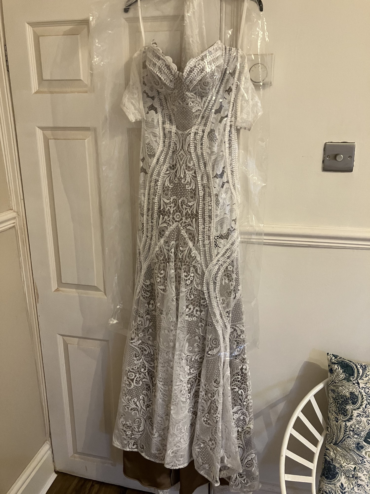 All worn once, dress has been professionally dry cleaned and is in perfect condition. It is being stored in the original bag, in a smoke free home. Also includes the matching 2 tier lovers society vine veil with it too (RRP £195)