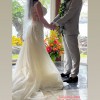 One of a kind handmade in Ukraine. This dress was the Magdalena, however, I added sparkle fabric and an extra layer so the dress is not see-through. I added a detachable over skirt which is the same sparkle material and is custom made for this dress. The dress has a very long train by itself. The over skirt is super long and gorgeous. I also had a veil made to match the dress. This dress was never altered and is in perfect condition. There are no stains and it is not dirty. Get ready to sparkle down the aisle!