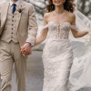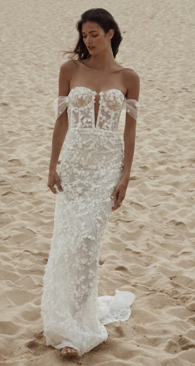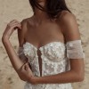 *Gaia is an expertly crafted strapless corset gown featuring delicate tulle off shoulder sleeve detailing which has been hand beaded with laser cut flowers and pearl beads. A deep “V” illusion panel meets a flattering fitted skirt which falls gently from the knees to the floor. A 55cm train follows gracefully behind. Channel your inner goddess with the Gaia gown.