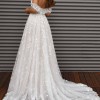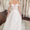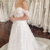 This romantic Martina Liana couture gown is an exquisite and delicate beauty. It features many decadent details, from the 3D fluttering floral embellishments to voluminous, flowing, porcelain tulle. The sweetheart neckline is covered with layers of floral lace details, with sheer elements showing off the intricate details. The sexy exposed boning in the bodice peeks through the sheer Chantilly lace for a demure, high-fashion look. All through the skirt, the breezy 3D floral appliques add irresistible dimension and texture to this A-line gown. The off-the-shoulder straps add a final whimsical and romantic touch, with the 3D appliques giving this couture gown a sexy, elegant, and ethereal feel.