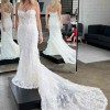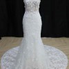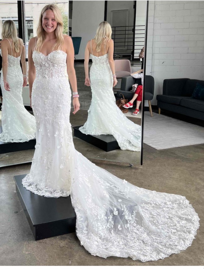 Breathtaking white dress with pearl-beaded spaghetti straps. It features a flattering heart-shaped neckline, adding a soft, romantic touch to the overall design. The top is a corset-style bodice with a slight sheer element, giving it an elegant and slightly ethereal look. The dress is adorned with 3D floral embellishments that bring texture and depth to the gown, creating a unique and enchanting effect. The gown is fitted through the bodice, before flowing out into a beautiful skirt, complete with a bustle.
