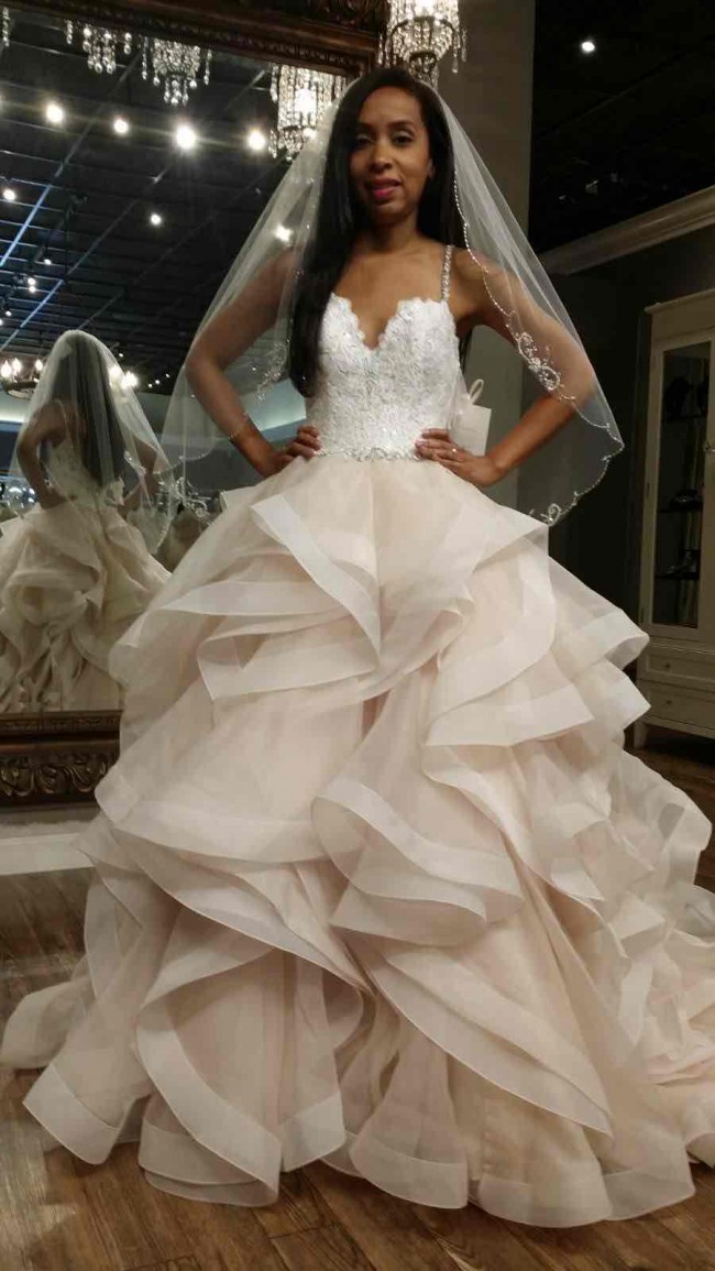 This is a spaghetti strap designer wedding dress and accented with a stunning sweetheart neckline. This wedding dress is brand new with tags attached and inside of garment bag. The veil is brand new and has delicate beading. The veil is inside plastic bag and tag is attached. The veil is included in the selling price. This a pet free/smoke free/drug free home. The bridal gown & veil is in excellent condition.