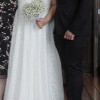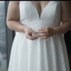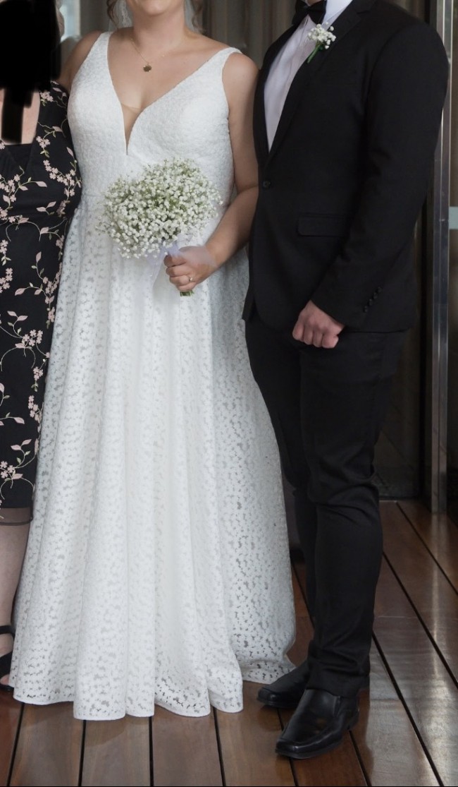 This dress is so beautiful it deserves to be worn again! The lace flower detail all over makes it feel like a really special dress. It is very comfortable and flattering. I hope it makes another bride feel as beautiful as I did on my wedding day. Has been dry cleaned and looks near perfect condition.