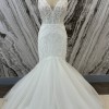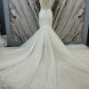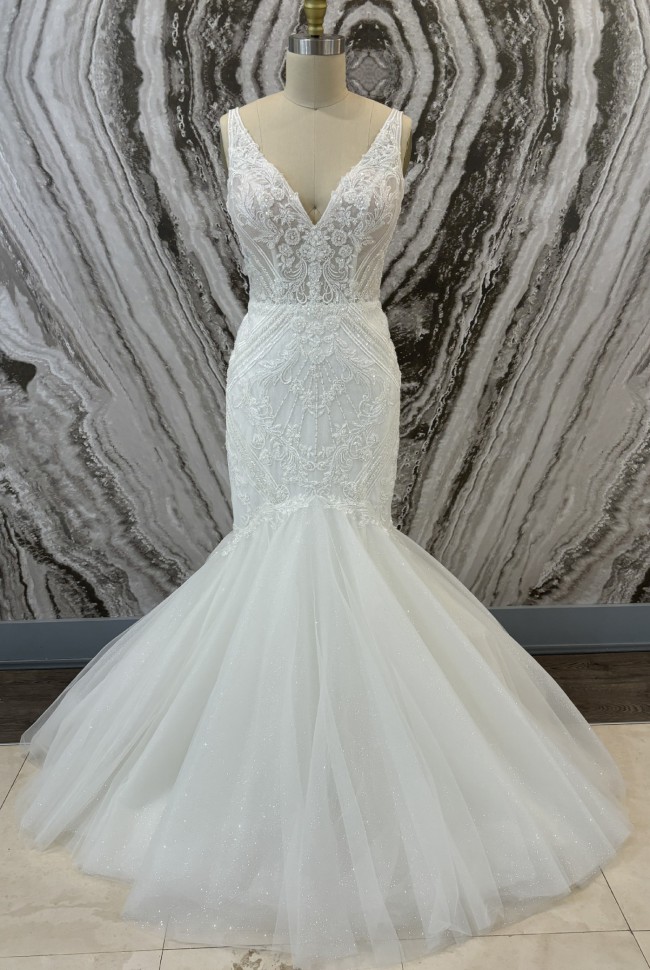 A blend of traditional beaded lace and modern glittering tulle, Style 1532 puts a new twist on classic bridal style in this stunning fit-and-flare wedding dress. Intricately beaded floral lace adorns the sheer bodice from the elegant shoulder straps to the flattering curve-hugging fit past the hip. A glamorous V-neckline further accentuates the impeccably-placed lace in the front and matches the plunging side cutouts and deep V-back detail. Past the hip, a heavy detail sparkle shimmers in the light as layers of tulle effortlessly flare out into a wispy and romantic sweeping train.
