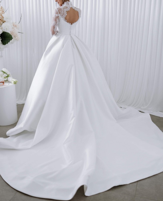 A custom made gown by Yulia Mcauley. Beautiful lace purchased from Saigon Fabrics in Erskine Street Sydney.