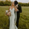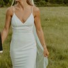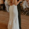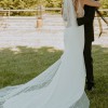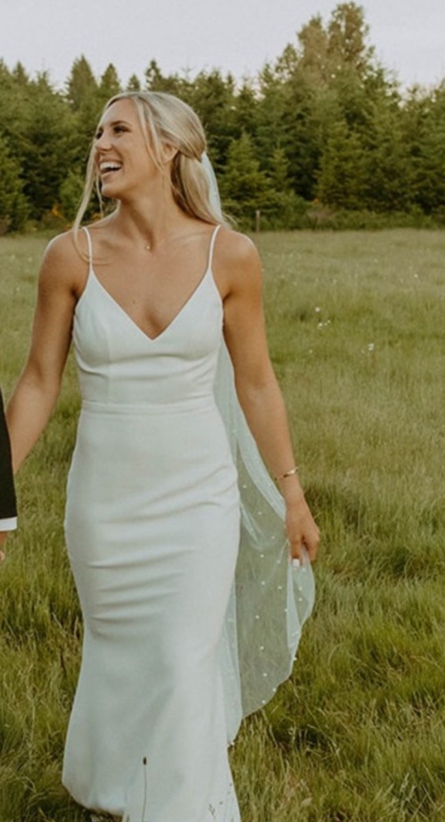 This dress is stunning! It’s a comfortable and timeless crepe material. There are the most delicate pearl details on the back. This dress features a lace overlay on the back of the dress. It almost gives the illusion of wearing your veil. I did add a bustle to the dress that made it easy to dance and move around all night. The dress was professionally cleaned. I ordered a size 8, but had some alterations. I also added in some cups for the chest which can be easily removed. People still comment on my dress and how beautiful it was!