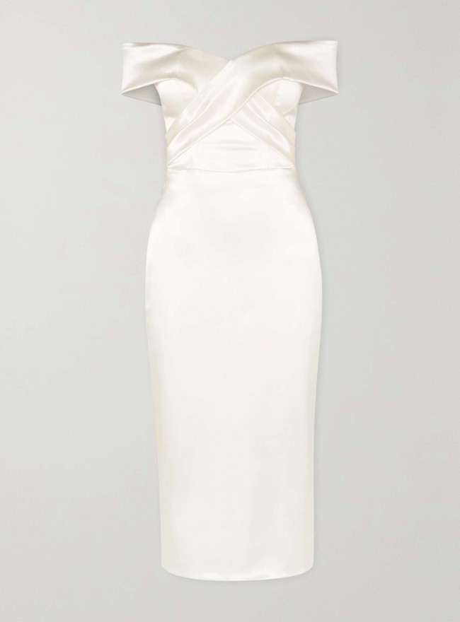 The 'Kelly' dress is beautifully cut from satin for a close fit and has an elegant off-the-shoulder neckline.