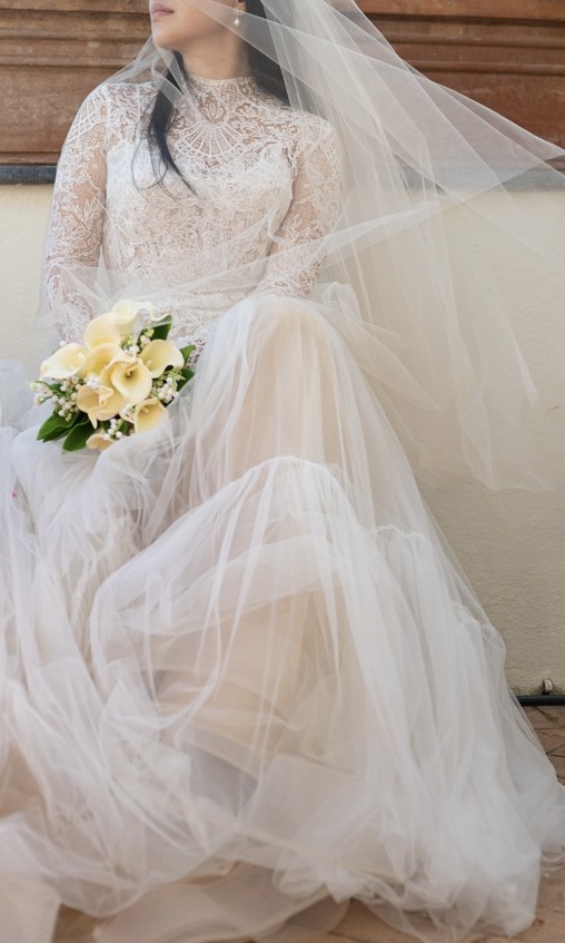 Classic & Modest. Dress is light weight and easy to move in with beautiful layers of nude and ivory tulle that work gorgeously in photographs.
