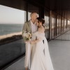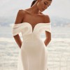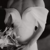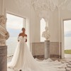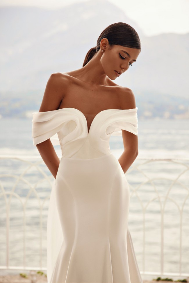 Stunning silhouette dress by Olya Mak. "Charmy" is made of crepe, with sheer fabric cascading around the shoulders and draping into a bow. Purchased in December, wedding was in March. No adjustments to bust, waist or thighs made. Only alteration was to length. Dress was worn for approximately 3 hours for ceremony and photos.