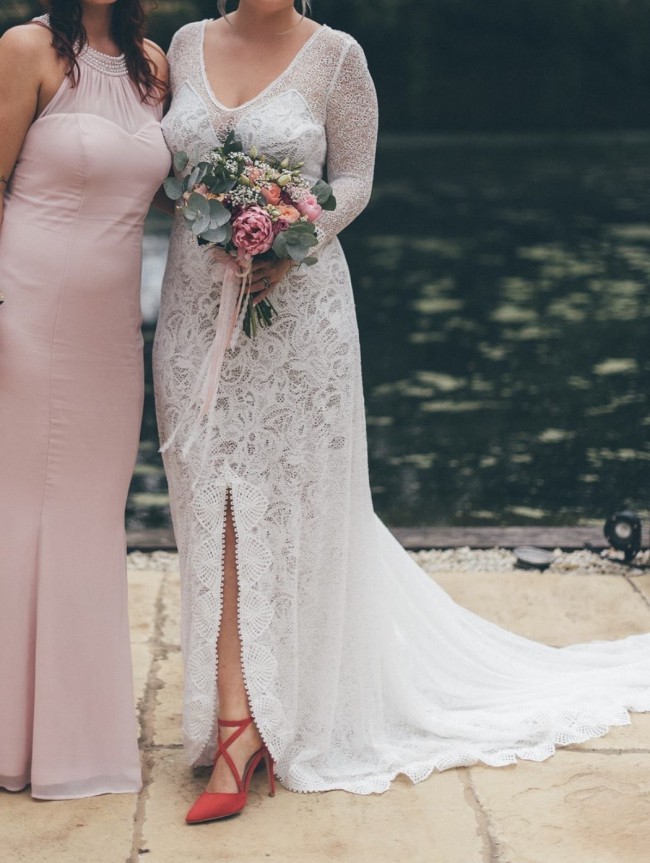 Worn once on wedding day in 2018 and has since been cleaned, repaired and stored safely.
