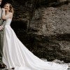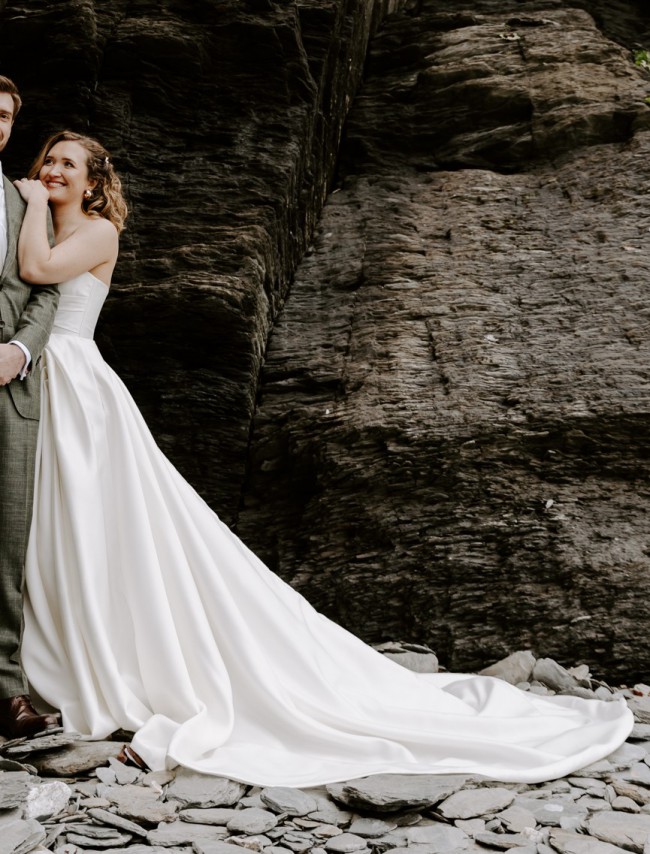 An absolutely showstopping sheer satin wedding dress with asymmetric sweetheart strapless corset. A draped skirt with a thigh-high slit proceeds into a dramatic train for a really memorable moment.