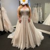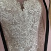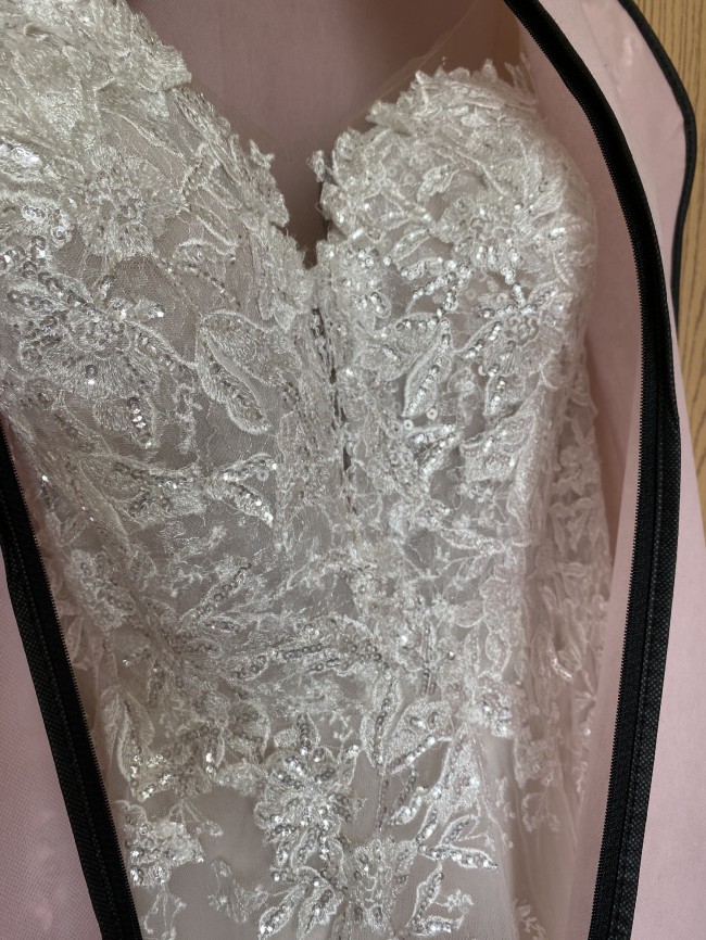 The lighting in these photos does not do this dress justice. There are layers of shimmering fabric beneath layers of sequined fabric that catches light and make you sparkle from all angles. This dress is made from organic lace, featuring a partial illusion top, that sits very flattering off the shoulders and beautiful crystal buttons up the back. There are so many gorgeous details to this dress!