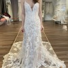 A dreamy, sheer train of dropped blossoms trails behind the minimalist silhouette of this sleeveless sheath gown.