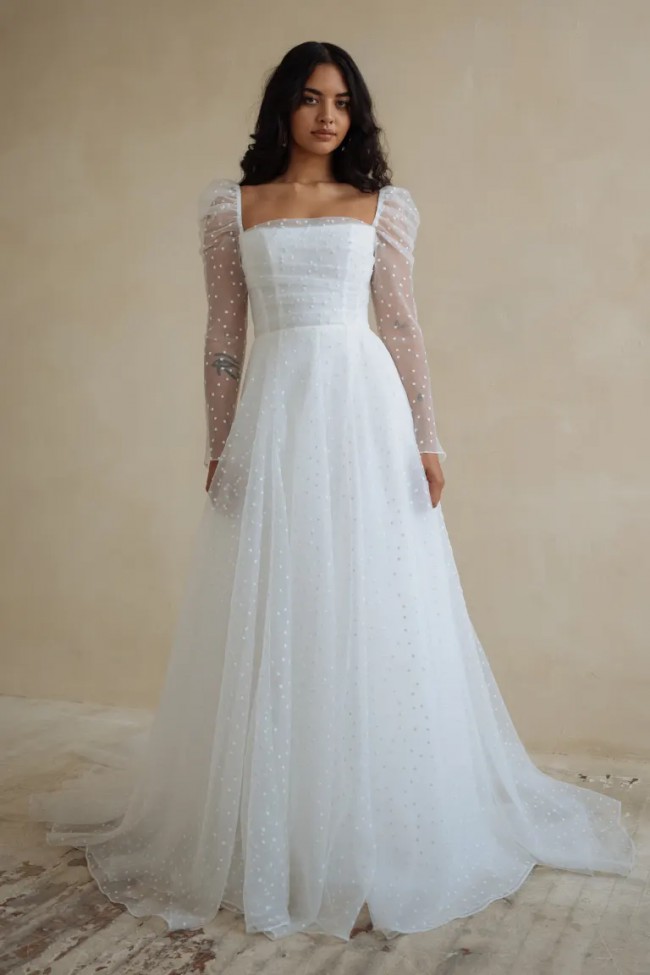 The Evangeline gown is as versatile as she is whimsical. Cut in our playful French dot organza, the delicately pleated bodice features exposed boning to flatter your shape and offer support. The dramatic puff sleeves can easily be detached for a truly transformed look.