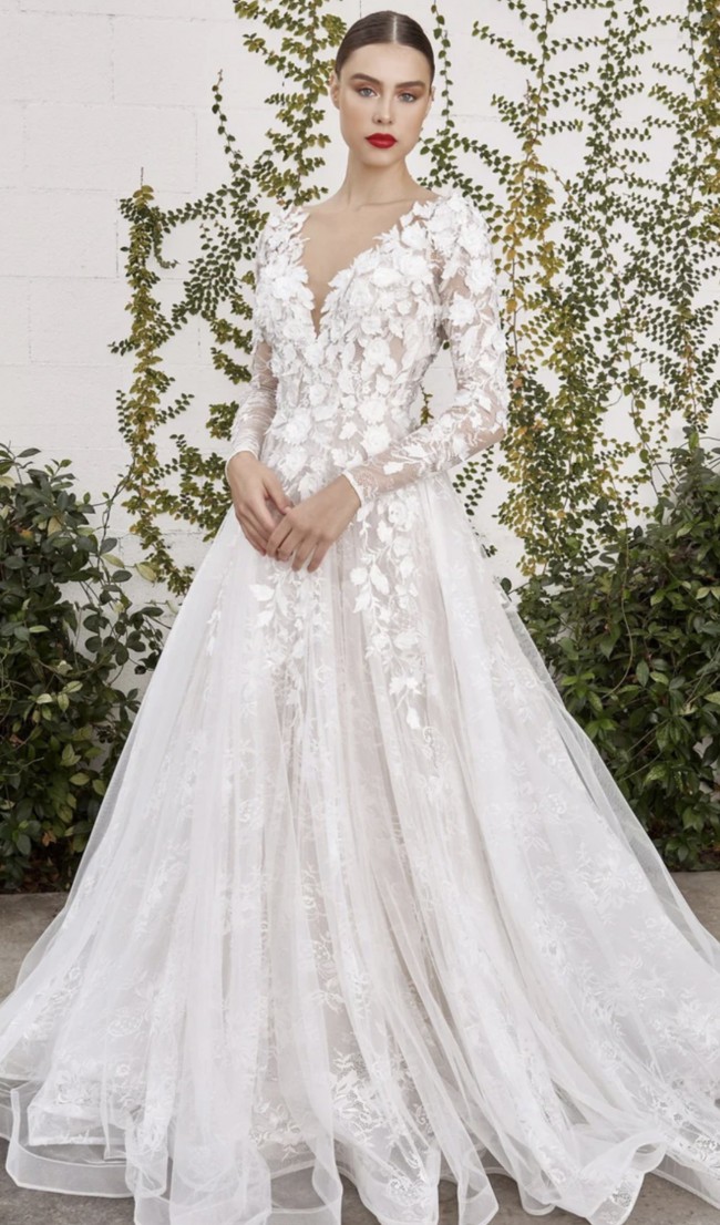 Yvaine is a beautiful dress with 3D floral vines that fall along sheer sleeves & soft A-line silhouette. Classic V-neckline is edged with flower petals.