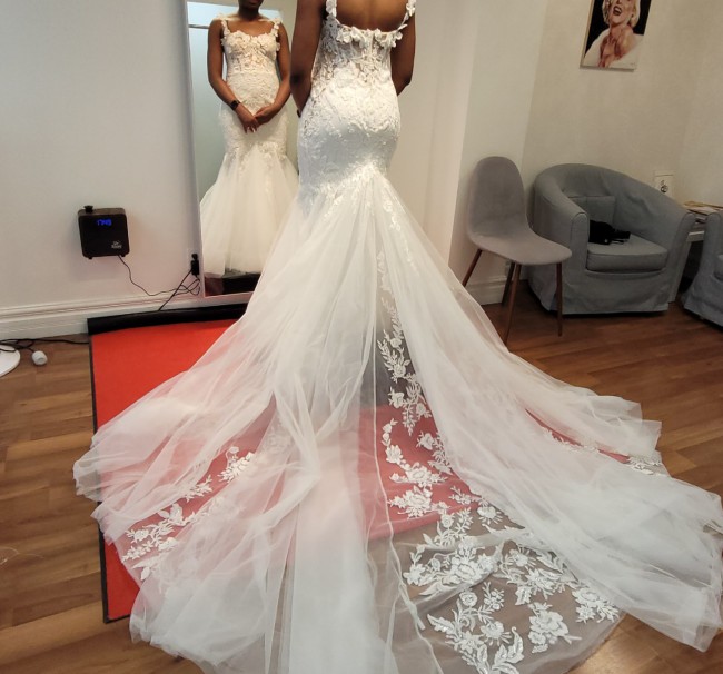 This Enzoani Narine has an enchanting mermaid silhouette that accentuates my curves beautifully, allowing me to feel both stunning and confident. The sweetheart neckline adds a touch of romance, perfectly paired with delicate straps that provide both support and style.
