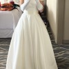 This dress features a modern yet classic A-Line design. It is white with an ivory tinge. The bodice is structured with boning and features an off the shoulder neckline with capped sleeves. It is snug on the waist and enhances curvature around the hip. There is an attachable silk bow for the waistline and elegant buttons that run from the mid-back to lower-back.