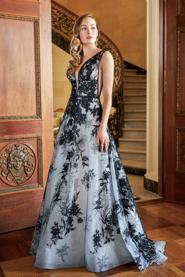 A glamorous A-line gown of magnificent tulle, adorned with an intricately embroidered lace, bedecked with beading and sequin underlays. The enchanting lace drifts elegantly across the shimmering tulle, with a captivating open back. Completing the look, this gown features a mesmerizing 70