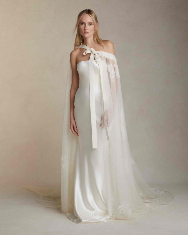 Semi-custom Danielle Frankel ‘Apollo’ cape. One size fits all. Worn once. Soft tulle decorated with hand cut Chantilly and corded lace appliqués throughout. Undulating hem measures 85” at longest point. Grosgrain ribbon tie.