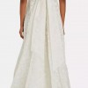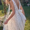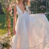 This is your moment; show up and stun in the Devyn Gown by LoveShackFancy! Composed of intricate custom lace overlay with a tiny picot trim, this romantic dress features a plunged V-neckline. An empire waist gives your body a flattering fit, before cascading down into a lavish full sweep skirt that allows you to move with ease. Side seam pockets give you added versatility. Turn around to reveal a low back with long sashes that tie in a gorgeous draped bow.