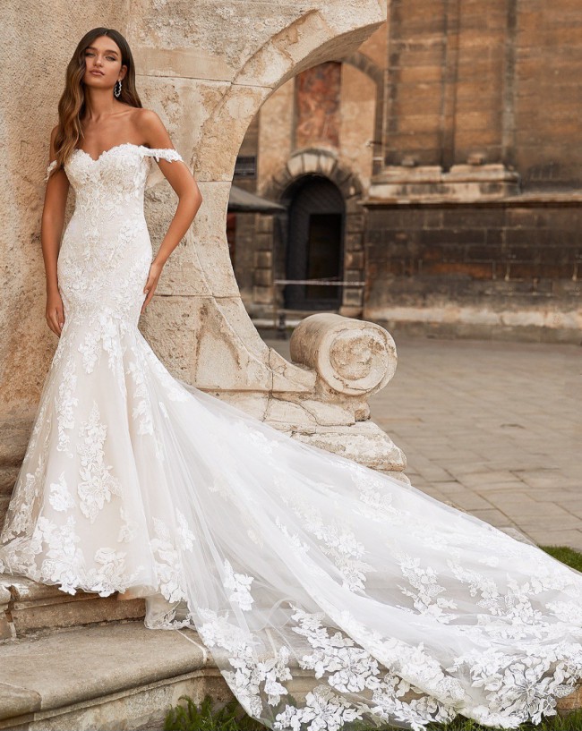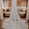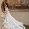 The back of the wedding dress features an open illusion back with a display of rhinestones, sequins, and other beadings. With a stunning floral lace cathedral train that finishes with a unique organic lace and horsehair trim hem.