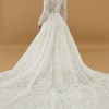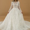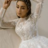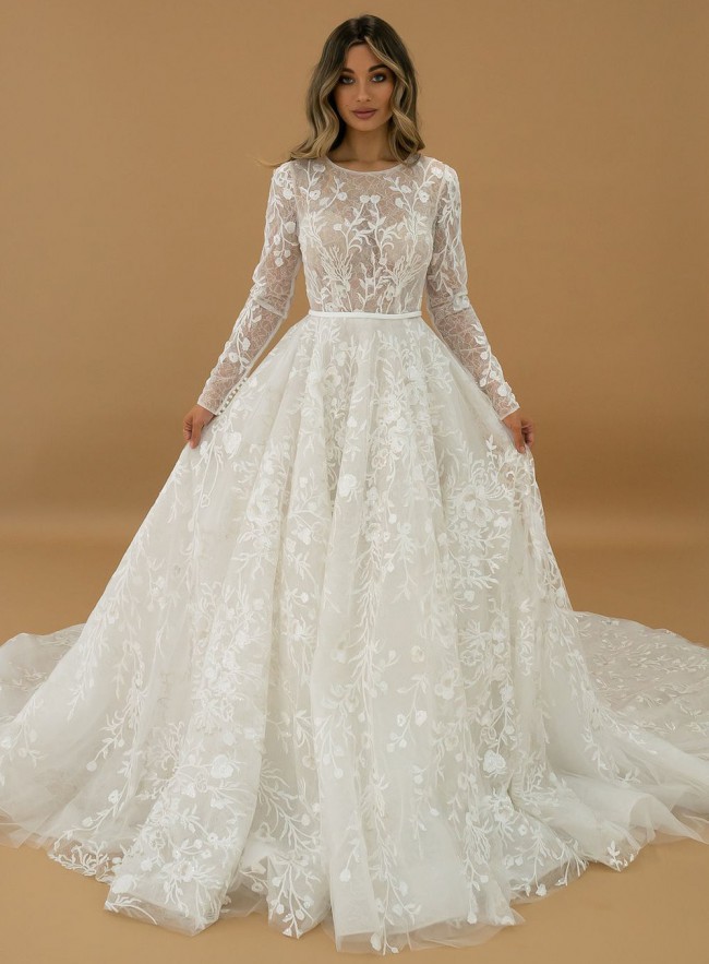 A modern, yet modest gown, this beautiful wedding dress from Australian designers Zavana Couture, has a ballgown skirt, high neckline, sheer sleeves, and romantic champagne-toned floral lace.