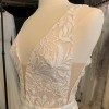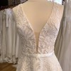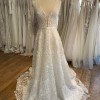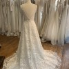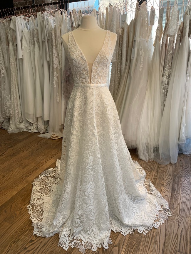 This listing is for a sample Daalarna gown (style number 211 m) with beautiful all over floral lace with clear sequins throughout! It has a v-neck front and back line with a beautiful satin bow at the waist. The bodice is lined with light beige fabric and there is illusion mesh at the center front. The gown has been tried on in our bridal shop but has never left the shop. It has not been altered.