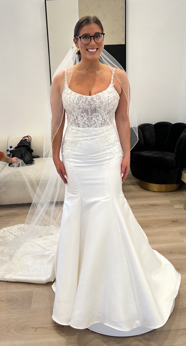 Never worn wedding dress!! My normal dress size is an 8 (M). Hourglass figure. The dress hugs the body nicely!! The size of the dress in the pictures is a 12 & it was a little tight on my thighs and butt so I ordered up a size. It is a size 14 with no alterations. Sleeves do not come with it! They were just an option for alterations once my dress came in. The beading is stunning. Even the straps are beaded. It is a scoop neck. I’m a size DD for reference. The buttons go all the way down the train, which was such an elegant touch. Would pair with a simple veil to really highlight the details of the dress. Hoping it finds a beautiful home!!