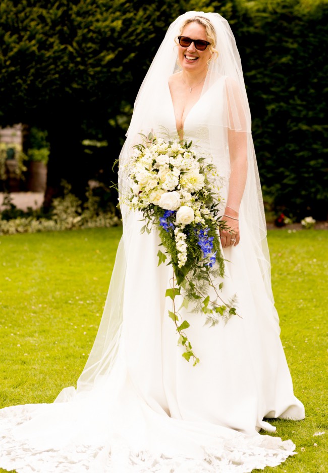 If you want to feel like a princess on your wedding day then this is the dress for you. A satin ball gown featuring deep plunging v-neckline and v back. To al beaded & sequins lace appliqués cascade down sides of bodice into the skirt & create a cutout cathedral length train. The dress is finished with pockets and satin covered buttons extending down back to start of train. I am